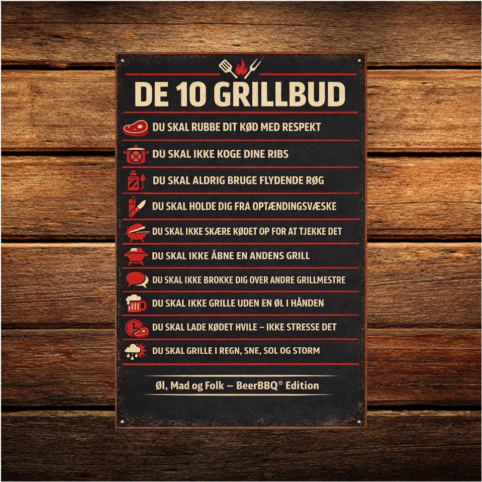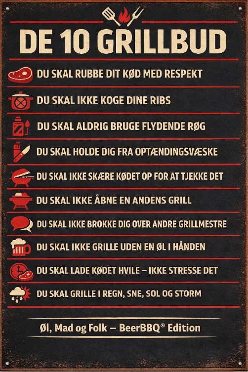 De 10 Grillbud er en humoristisk og kærlig opsummering af de uskrevne regler, enhver grillmester kender – og enhver gæst bør respektere.