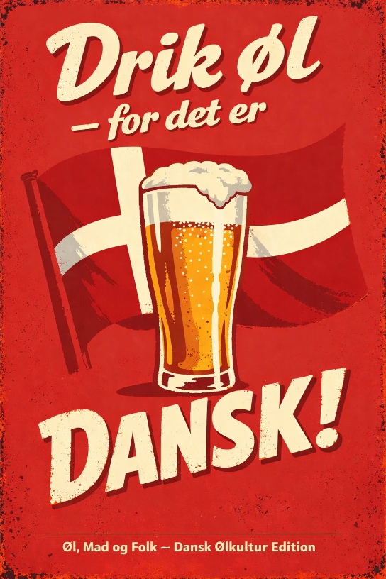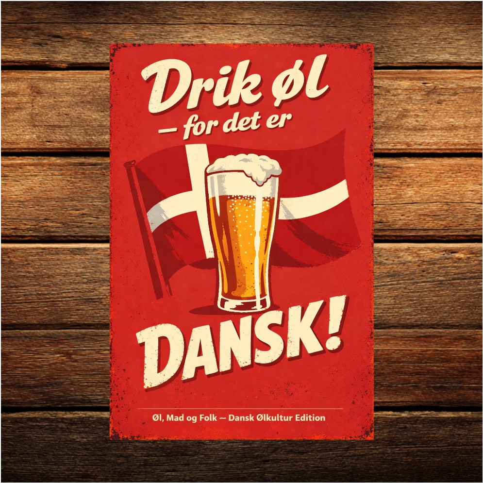 “Drik øl – for det er dansk!” er en kærlig, humoristisk hyldest til dansk ølkultur, fællesskab og den simple glæde ved et koldt glas. Et skilt med både national stolthed og selvironi – serveret i rødt, hvidt og gyldent skum.