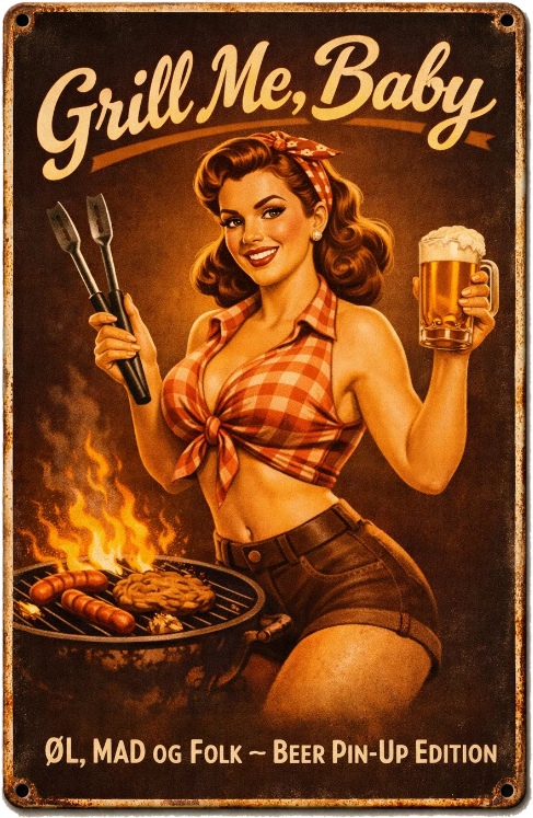 Dette metalskilt er en kærlig, selvsikker og lettere fræk hyldest til grillglæde, kolde øl og klassisk pin-up-attitude. Her er der ingen tvivl om signalet: grillen er varm, øllen er kold – og stemningen er sat.