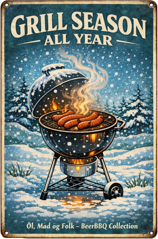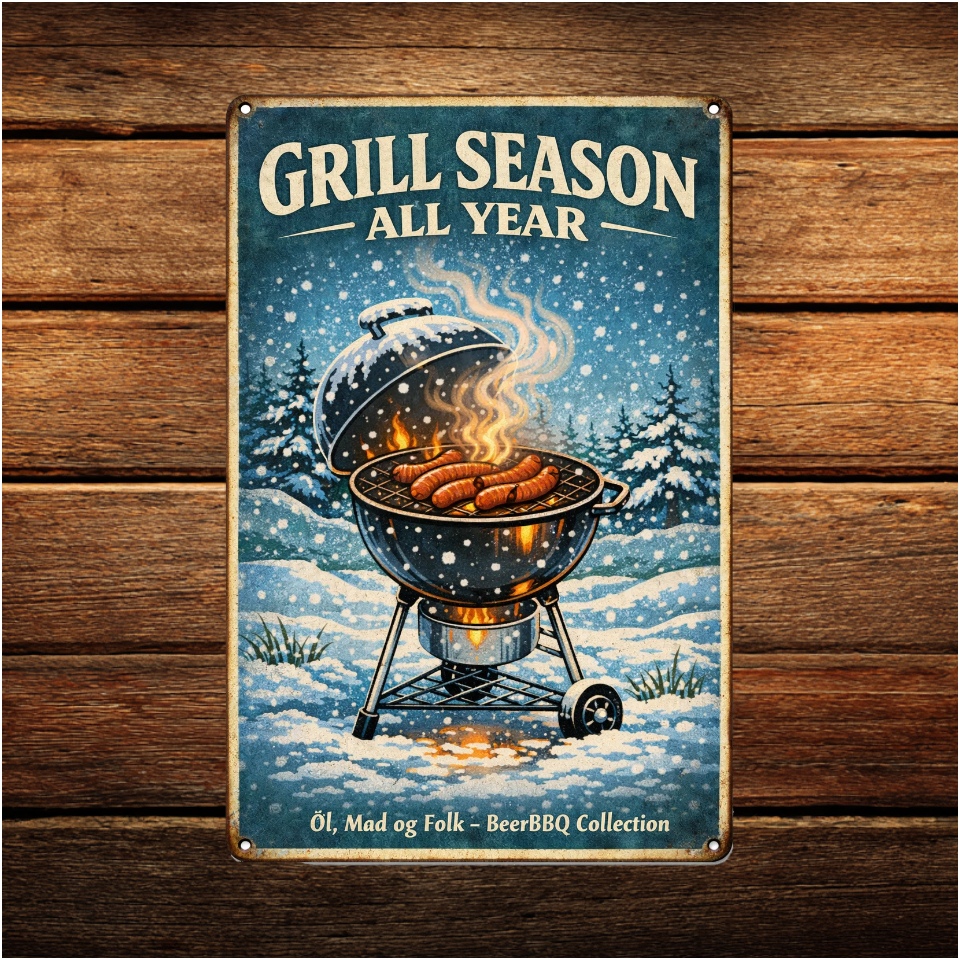 “Grill Season – All Year” er et statement for dem, der ikke pakker grillen væk, bare fordi kalenderen siger vinter. Sne, frost og kolde fingre er ikke stopklodser – de er bare en del af oplevelsen. Flammerne tænder, pølserne syder, og sæsonen fortsætter.