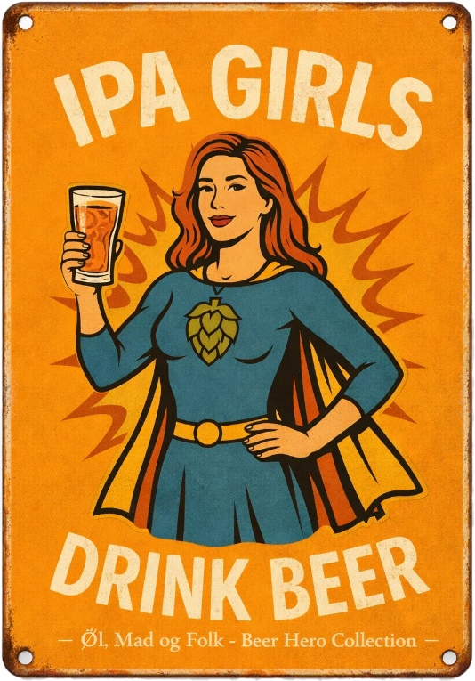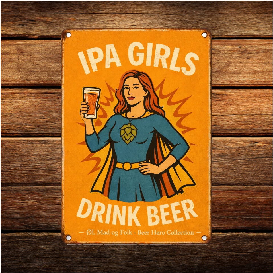 Skiltet er en del af Beer Hero Collection, hvor øltyper bliver forvandlet til ikoniske heltefigurer i retro comic-stil – med humor, styrke og kærlighed til øllets mangfoldighed.