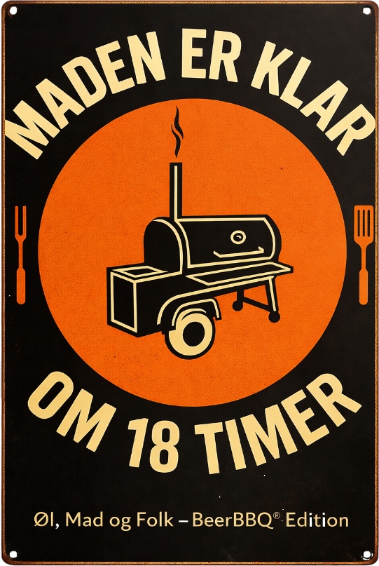 “Maden er klar om 18 timer” er et kærligt nik til low & slow-filosofien, hvor tålmodighed, røg og ro er lige så vigtige ingredienser som kødet selv. Et skilt til dem, der ved, at god mad ikke stresses – den får tid.