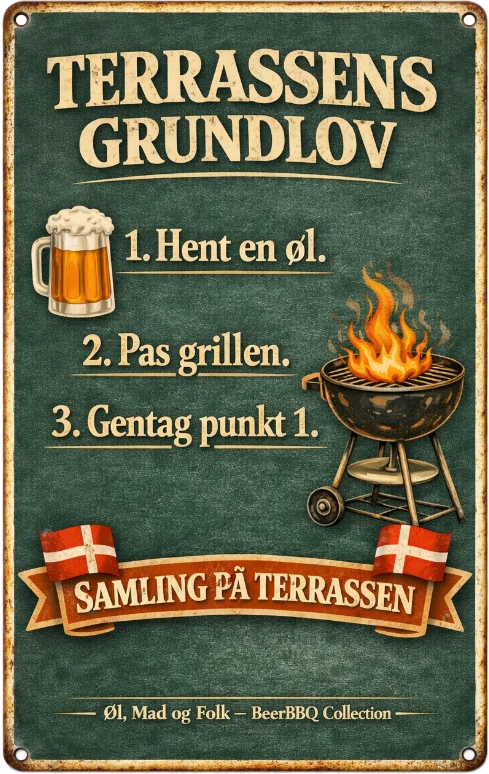 “Terrassens Grundlov” er en humoristisk og meget genkendelig opsummering af livet omkring grillen og øllen. Reglerne er enkle, demokratiske og nemme at huske: hent en øl, pas grillen – og gentag. Mere behøver man egentlig ikke vide.