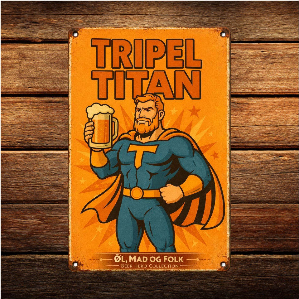 Skiltet er en del af Beer Hero Collection, hvor ikoniske øltyper bliver fortolket som retro superhelte med humor, personlighed og solid ølrespekt.